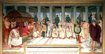 The mural over the entrance to the Hearing Room depicts an incident in the reign of Caesar Augustus Octavius. The Roman writer Seutonious tells of Scutarious, a Roman legionnaire who was being tried for an offense before the judges seated in the background. The legionnaire called on Caesar to represent him, saying: "I fought for you when you needed me, now I need you." Caesar responded by agreeing to represent Scutarious. Caesar is shown reclining on his litter borne by his servants. Seutonious does not tell us the outcome of the trial but leaves us to surmise that with such a counselor he undoubtedly prevailed.