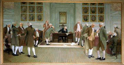 The mural above the bench is the signing of the United States Constitution on September 17, 1787, in Philadelphia. George Washington is shown presiding. On the left, Benjamin Franklin is easily recognizable. On the right, James Madison, "Father of the Constitution" is shown with his cloak on his arm. Although he was in France at the time, Thomas Jefferson was painted into the mural because of his great influence on the principles of the Constitution.