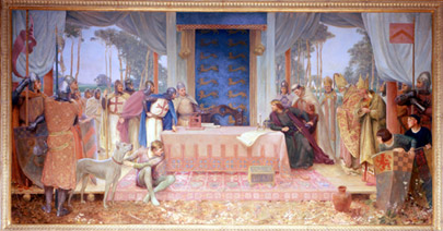 The mural on the left of the Hearing Room shows King John of England (1166-1216) sealing and granting Magna Charta (the Great Charter) in June 1215 on the banks of the Thames River at the meadow called Runnymeade. His reluctance to grant the Charter is shown by his posture and sullen countenance. But he had no choice. The barons and churchmen led by Stephen Langton, Archbishop of Canterbury, forced him to recognize principles that have developed into the liberties we enjoy today. King John, out of avarice, greed or revenge, had in the past seized the lands of noblemen, destroyed their castles and imprisoned them without legal cause. As a result, the noblemen united against the king.
